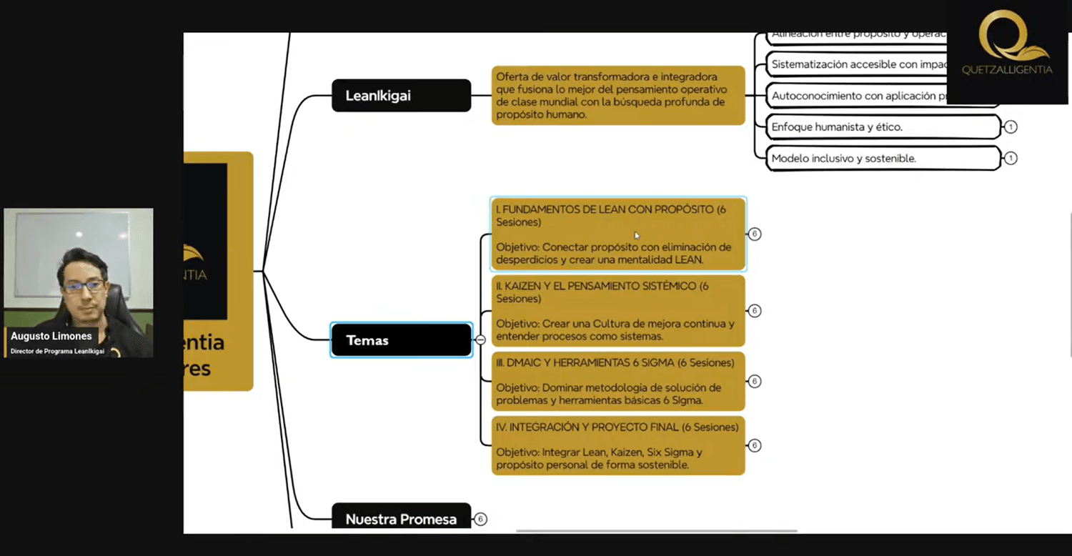 Es un programa semanal de clases en vivo (45 minutos cada miércoles) que combina Lean, Kaizen, Six Sigma y propósito personal en un solo sistema: LeanIkigai para que transformes tu caos en claridad.